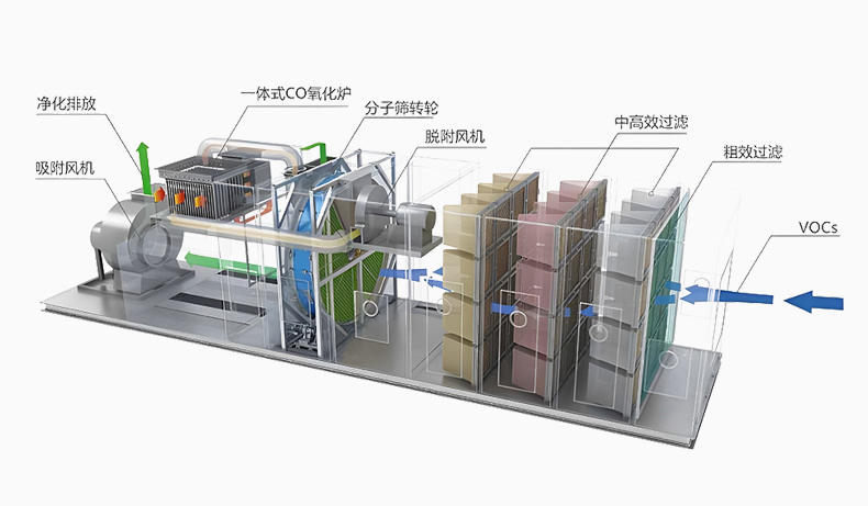 1) 有机午夜宅男视频先经过干式过滤预处理箱体去除午夜宅男视频中的粉尘等颗粒物,防止该类物质进入到沸石转轮中引起转轮效率下降;